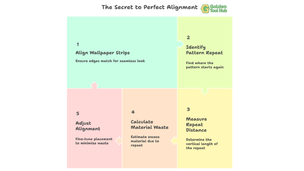 Wallpaper calculator guide showing 5 steps to align strips, identify pattern repeats, and calculate material waste for perfect feature walls.